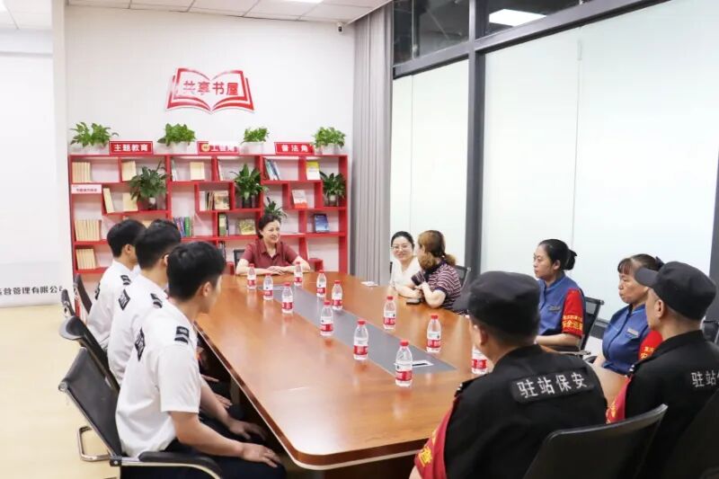 胡显易深入渝工港湾,查看驿站设施设备配备情况,细致询问场地日常运维、功能发挥实效及一线职工休憩补给的实际需求。随后,她与通邑公司轨道一号线项目部的保洁、安保一线人员围坐交流,深度了解大家的工作情况、轮班安排及防暑措施落实情况。