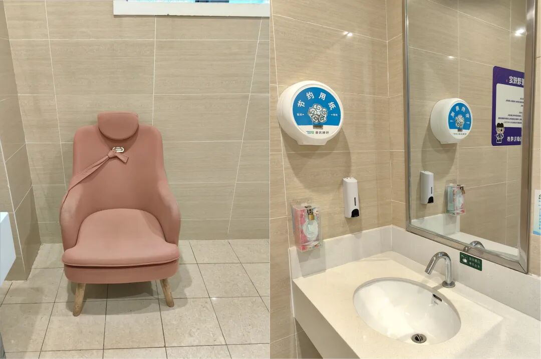 哺乳椅采用人体工学设计,贴合哺乳姿势,久抱娃胳膊也不酸;按压式洗手液、感应烘手机、水溶抽纸全配齐,给娃清洁超放心。
