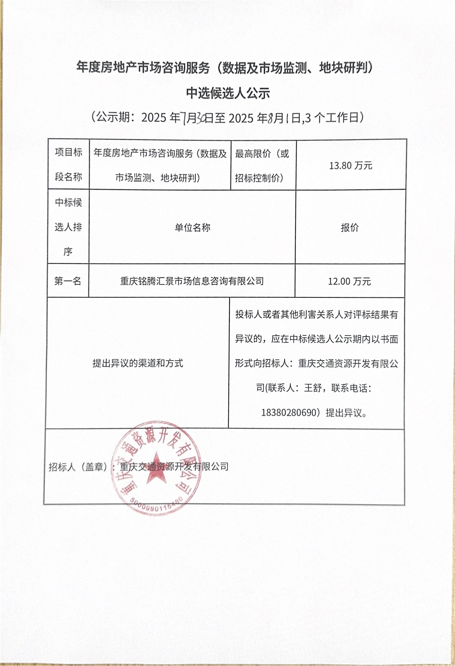 年度房地产市场咨询服务(数据及市场监测、地块研判)中选候选人公示