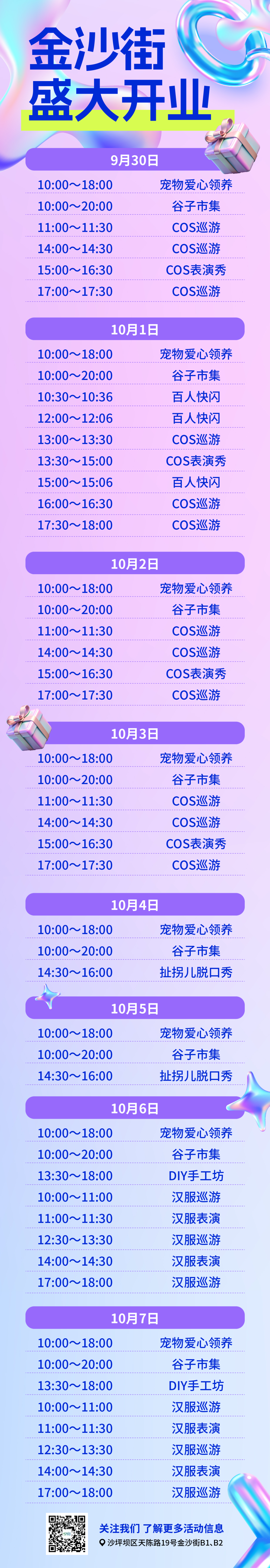 9月30日至10月7日,金沙街开业期间将推出多重福利活动,市民到店即可参与“开业狂欢礼”活动,包括关注领好礼、满额送现金券、消费抽大奖、5折团餐饮券等;同时,商场还将举办百人快闪、次元觉醒cos巡游表演、谷子市集、汉服巡游等精彩活动,为市民带来一场视觉与味觉的双重盛宴。