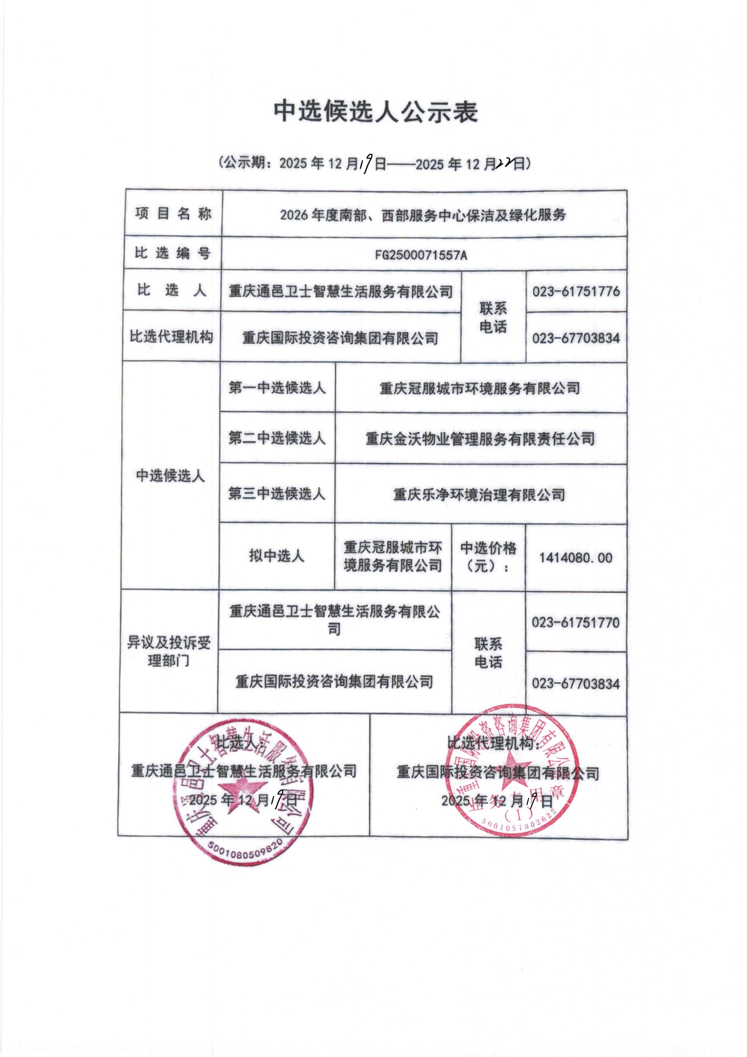 2026年度南部、西部服务中心保洁及绿化服务委外项目中选候选人公示