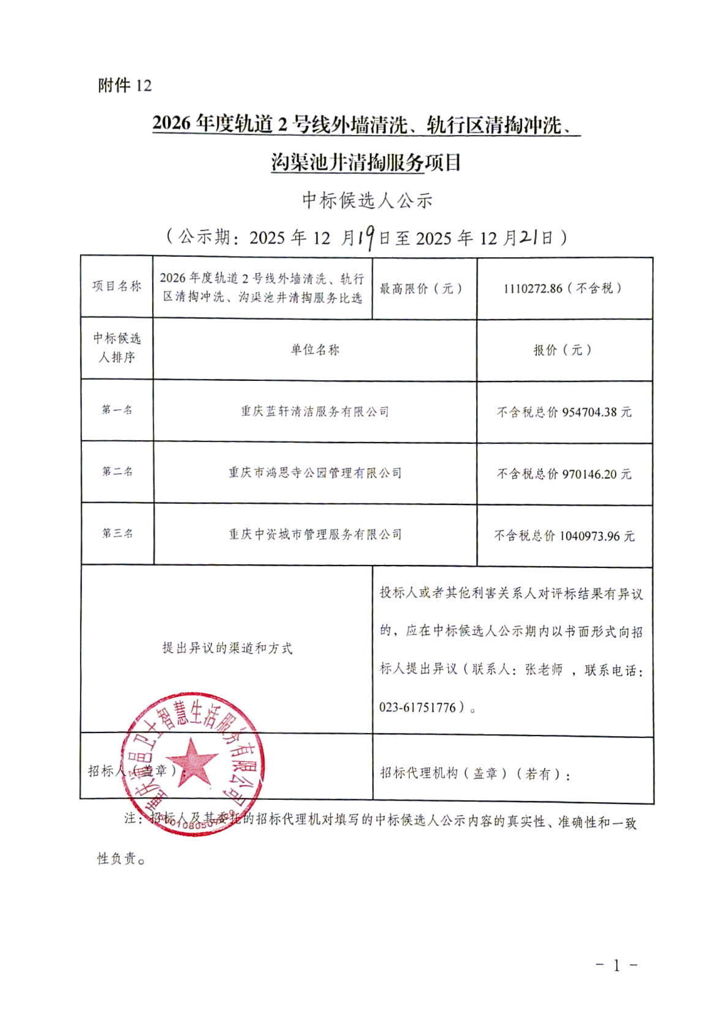 2026年度轨道2号线外墙清洗、轨行区清掏冲洗、沟渠池井清掏服务中选候选人公示